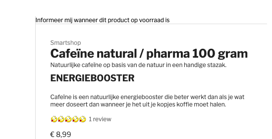 Als je op de hoogte wilt blijven van de voorraad en je wilt gratis en vrijblijvend een seintje in je mailbox ontvangen als er weer natural cafeïne is, dan kan dat. Zorg dat je als eerste op de hoogte gehouden wilt worden.